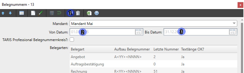 Das einfachste hier wäre den Belegnummerkreis zu kopieren (siehe 1). TARIS setzt jetzt automatisch in allen Belegarte die 'Letzte Nummer' auf 0, wodurch alle Belege bei 1 starten. Der Aufbau der Belegnummern wird allerdings beibehalten. Hier sollte jetzt der Gültigkeitszeitraum (siehe 2 / 3) festgelegt werden.