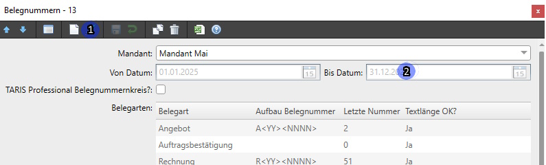 Legen Sie zum Jahreswechsel z. B. einen neuen Belegnummerkreis für Ihren Mandanten an, verwendet TARIS für Rechnungen mit Belegdatum des letzten Jahres noch automatisch den "alten" Nummerkreis.