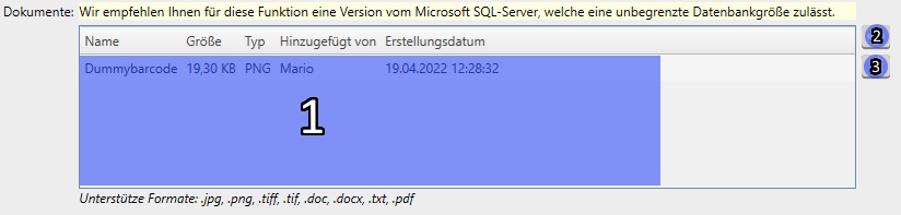 Dieses besteht aus der Liste mit allen verknüpften Dokumenten (siehe 1) sowie zwei Buttons zum hinzufügen (siehe 2) neuer bzw. entfernen (siehe 3) bestehender Dokumenten.