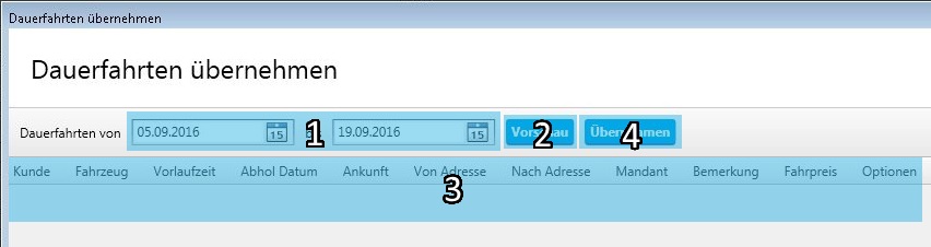 Wählen Sie über die Datumsfelder von / bis (siehe 1) den Zeitraum aus, für den Sie Fahrten übernehmen möchten.