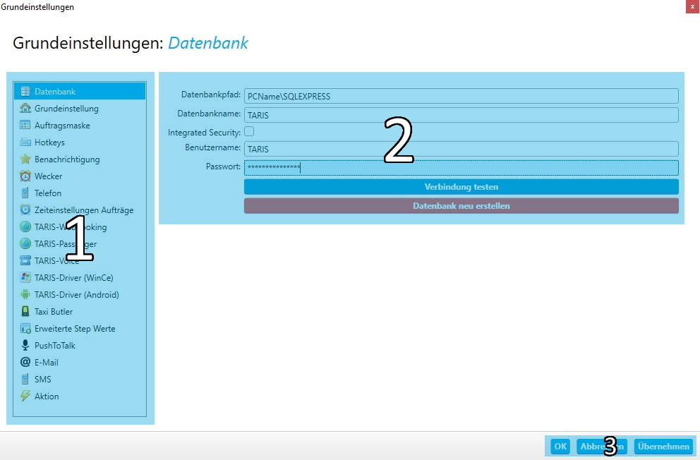 Dies können sowohl Einstellungen sein, die sich auf TARIS Dispatch beziehen (z. B. der Ort, an dem sich die Datenbank befindet, Einstellungen für den RufIdenten oder das Auftragszeitfenster) oder auch Einstellungen für externe Module (z. B. Einstellungen für TARIS-Driver).